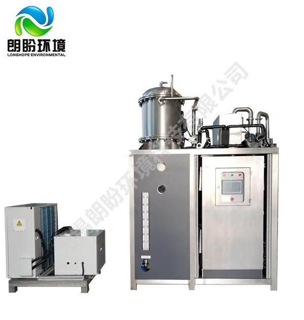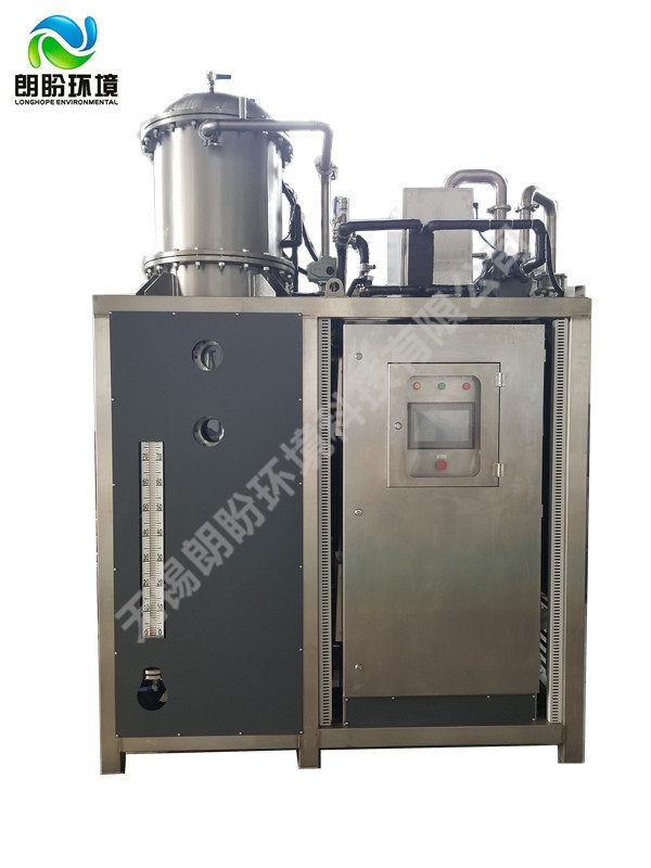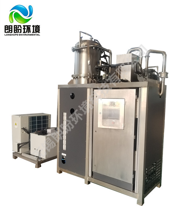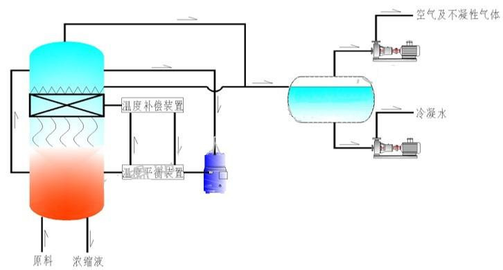低溫萃取濃縮器的原理是物料的沸點(diǎn)隨著壓強(qiáng)的降低而降低。低溫節(jié)能濃縮設(shè)備整體保持真空狀態(tài),濃縮室的真空度約為95%~97%,在此壓強(qiáng)下水的沸點(diǎn)為35℃~37℃,系統(tǒng)無需配備進(jìn)料泵,利用蒸發(fā)室的負(fù)壓將物料吸進(jìn)蒸發(fā)室,通過強(qiáng)制循環(huán)方式將物料循環(huán)霧化,傳輸至換熱器上,物料中水分被蒸發(fā),物料連續(xù)循環(huán)霧化,通過蒸發(fā)室液位自動(dòng)補(bǔ)料,濃度達(dá)到要求后作為濃縮液排出設(shè)備。濃縮液一般粘度較大,需采用泵抽出。