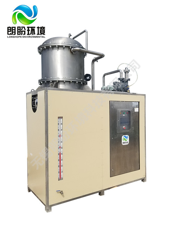 負(fù)壓濃縮蒸發(fā)器的原理是物料的沸點(diǎn)隨著壓強(qiáng)的降低而降低。低溫節(jié)能濃縮設(shè)備整體保持真空狀態(tài),濃縮室的真空度約為95%~97%,在此壓強(qiáng)下水的沸點(diǎn)為35℃~37℃,系統(tǒng)無需配備進(jìn)料泵,利用蒸發(fā)室的負(fù)壓將物料吸進(jìn)蒸發(fā)室,通過強(qiáng)制循環(huán)方式將物料循環(huán)霧化,傳輸至換熱器上,物料中水分被蒸發(fā),物料連續(xù)循環(huán)霧化,通過蒸發(fā)室液位自動(dòng)補(bǔ)料,濃度達(dá)到要求后作為濃縮液排出設(shè)備。濃縮液一般粘度較大,需采用泵抽出。