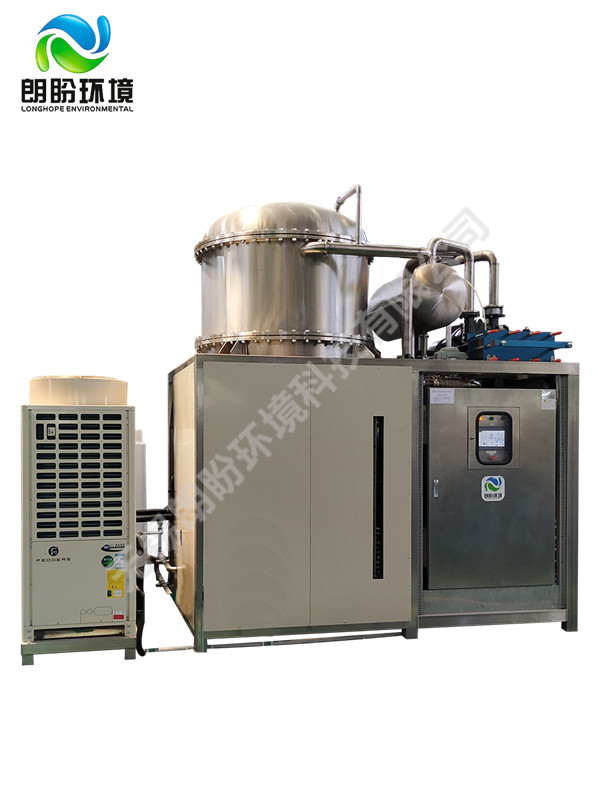 低溫蒸發(fā)結(jié)晶器的原理是物料的沸點(diǎn)隨著壓強(qiáng)的降低而降低。低溫節(jié)能濃縮設(shè)備整體保持真空狀態(tài),蒸發(fā)室的真空度約為95%~97%,在此壓強(qiáng)下水的沸點(diǎn)為35℃~37℃,系統(tǒng)無(wú)需配備進(jìn)料泵,利用蒸發(fā)室的負(fù)壓將物料吸進(jìn)蒸發(fā)室,通過(guò)強(qiáng)制循環(huán)方式將物料循環(huán)霧化,傳輸至換熱器上,物料中水分被蒸發(fā),物料連續(xù)循環(huán)霧化,通過(guò)蒸發(fā)室液位自動(dòng)補(bǔ)料,濃度達(dá)到要求后作為濃縮液排出設(shè)備。濃縮液一般粘度較大,需采用泵抽出。